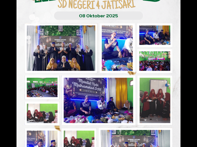 Pada hari Rabu, 8 Oktober 2025, SD Negeri 4 Jatisari menyelenggarakan kegiatan Peringatan Maulid Nabi Muhammad SAW dengan penuh semangat dan rasa syukur. Acara ini berlangsung di halaman sekolah dan diikuti oleh seluruh siswa, guru, serta staf sekolah.